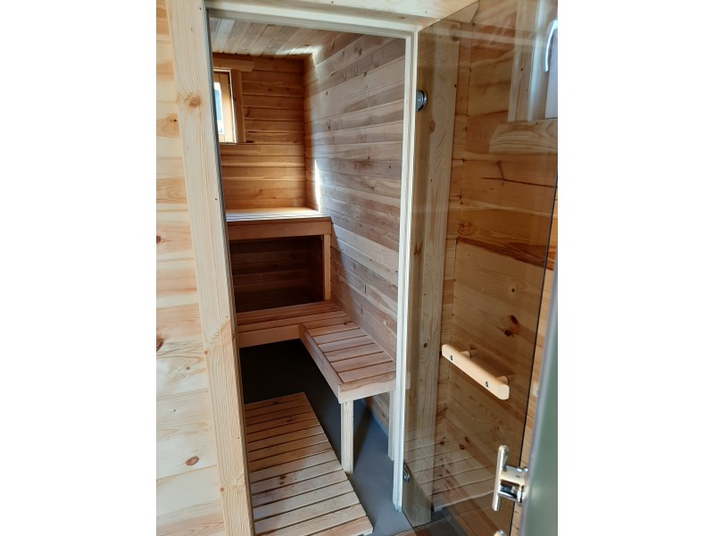 Стены и потолок в комнате отдыха и помывочной — имитация бруса из сосны.